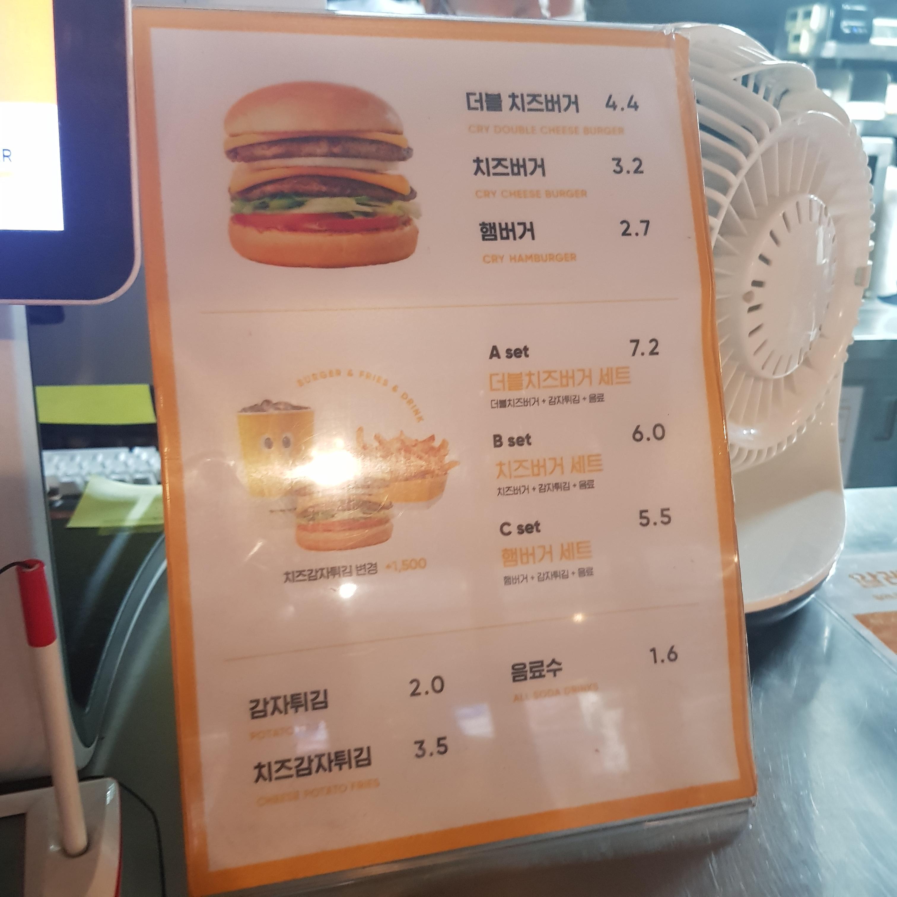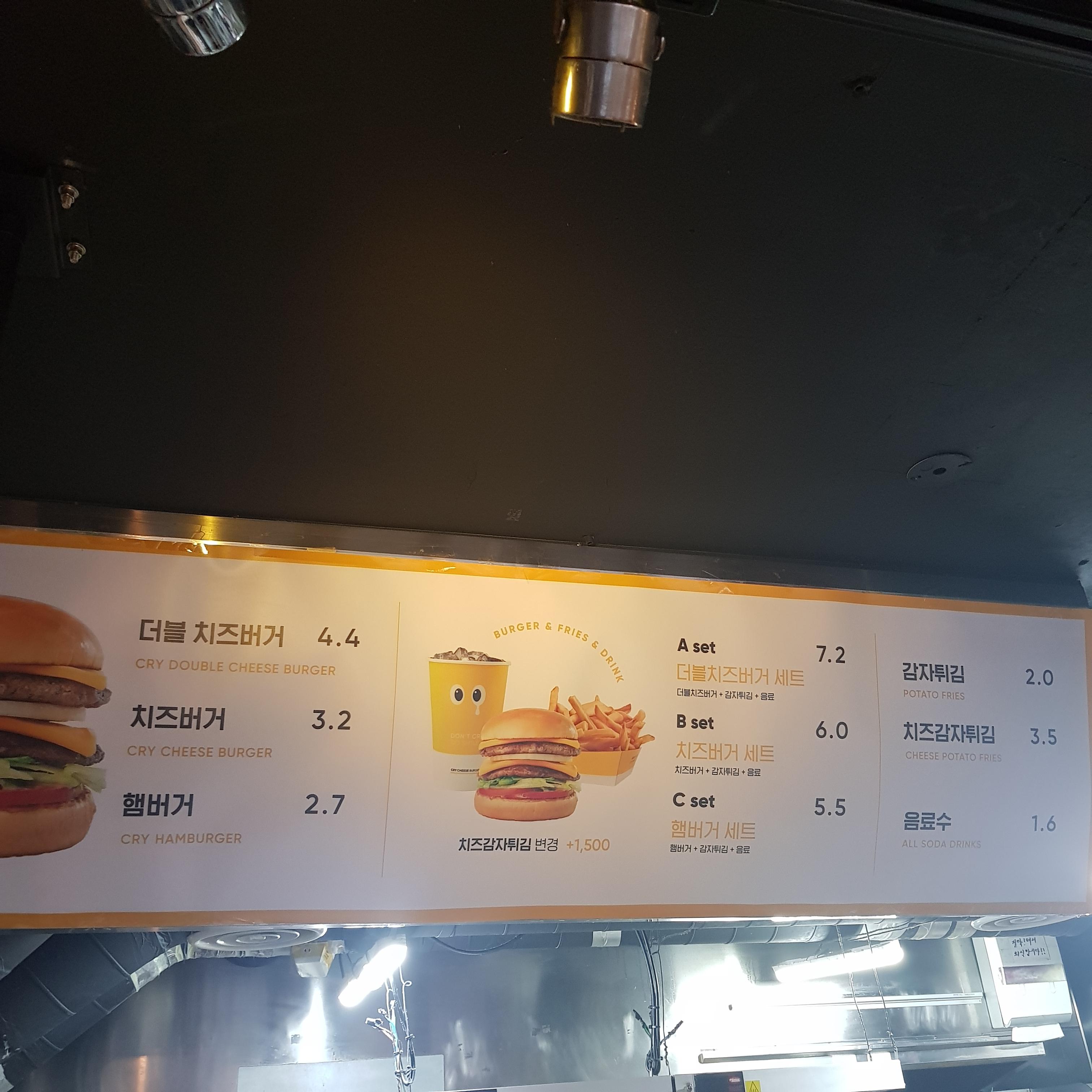 크라이 치즈머거 메뉴와 가격입니다.더블치즈버거 4400원