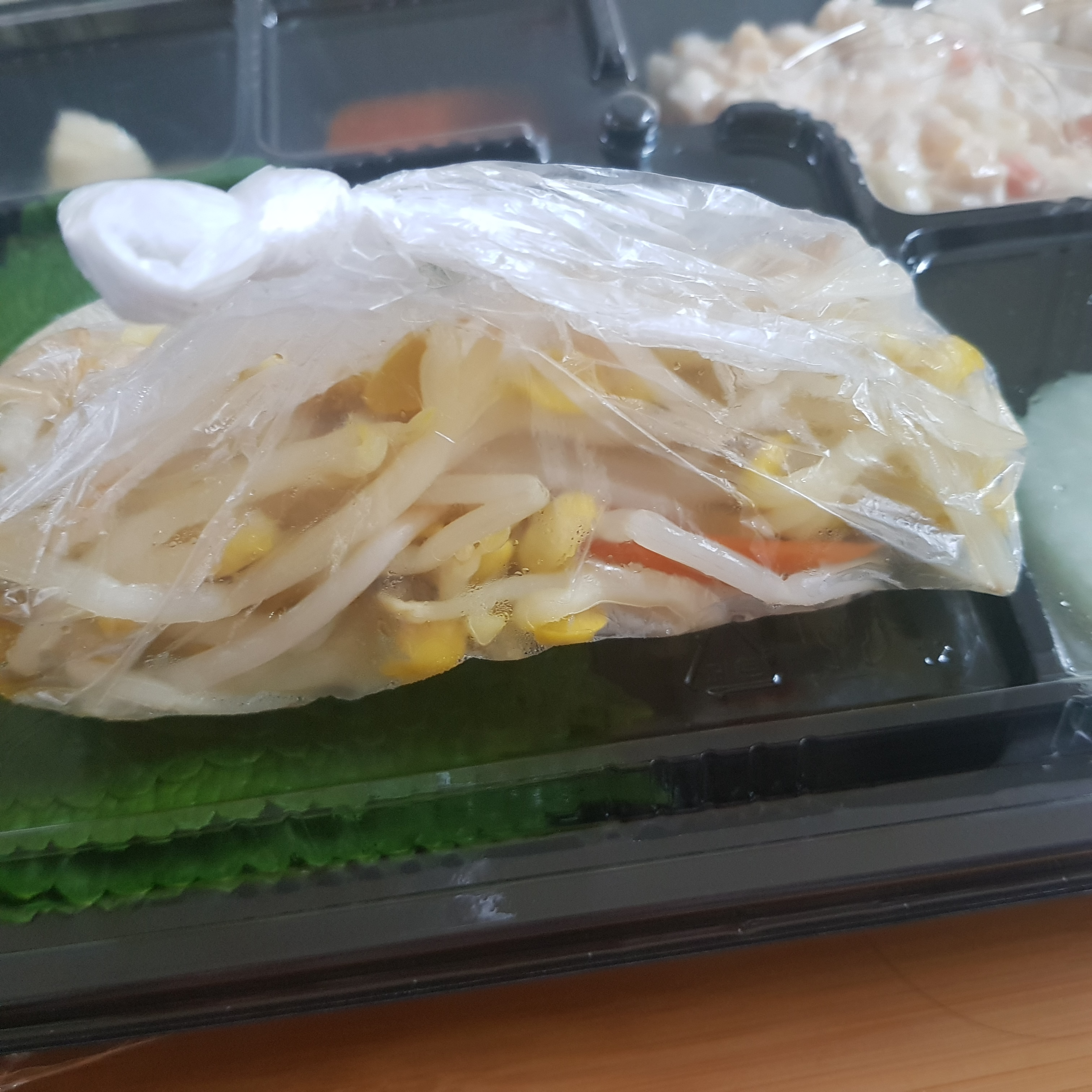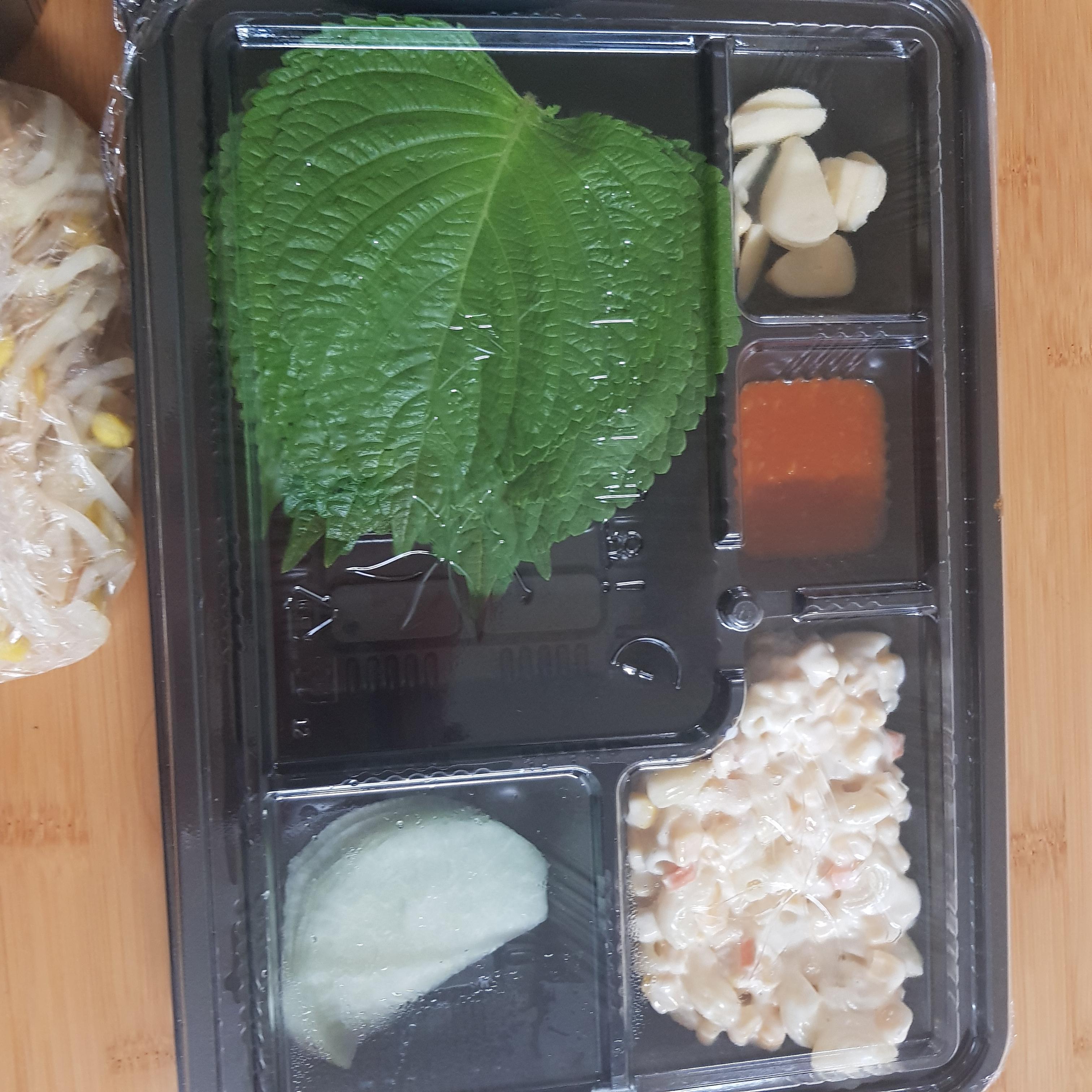 깻잎 , 무 ,마카로니,쌈장,마늘,콩나물이 들어있어요.