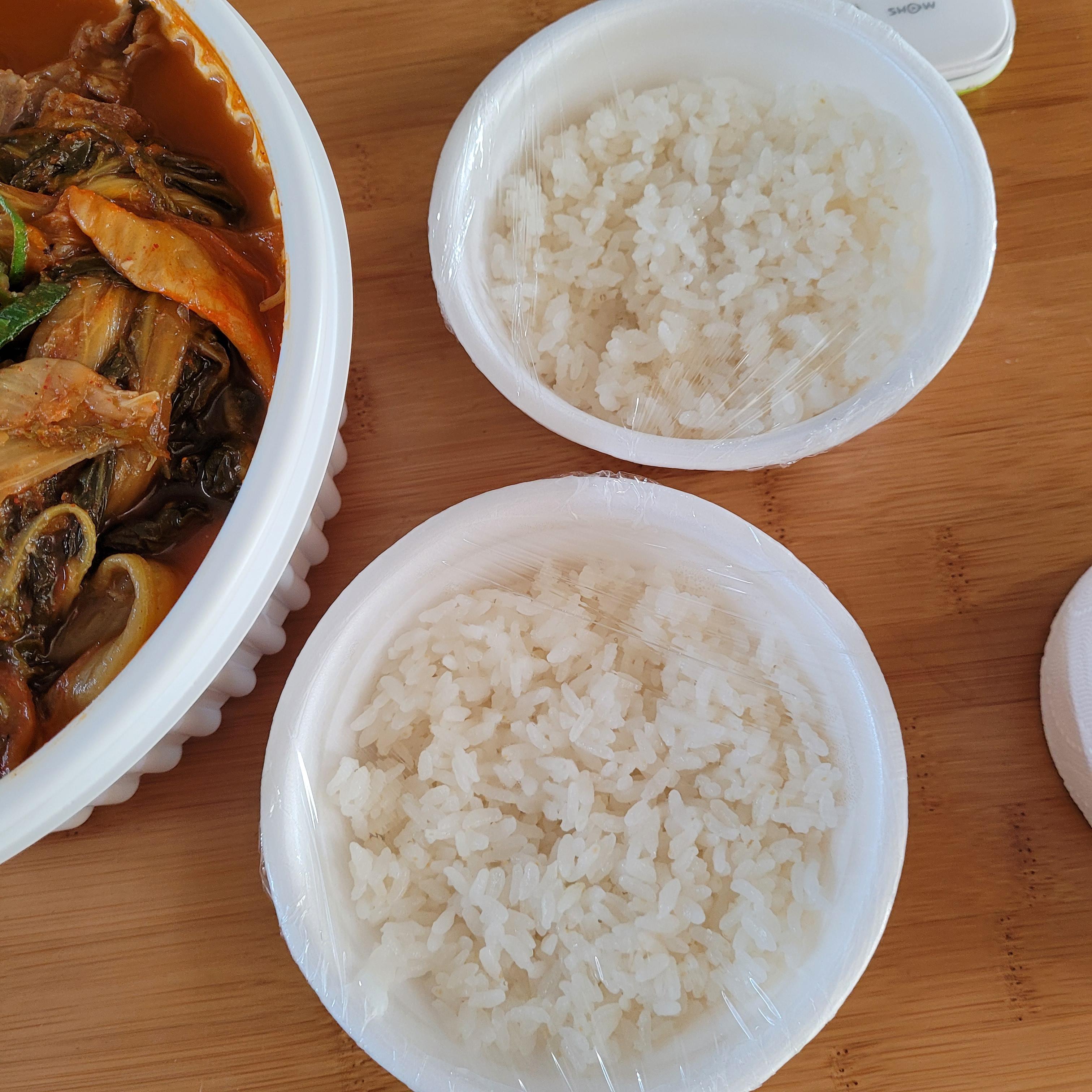 2인분을 포장하니 큰 뼈 5개와 공기밥, 무김치, 겨자소스 1개를 줍니다.