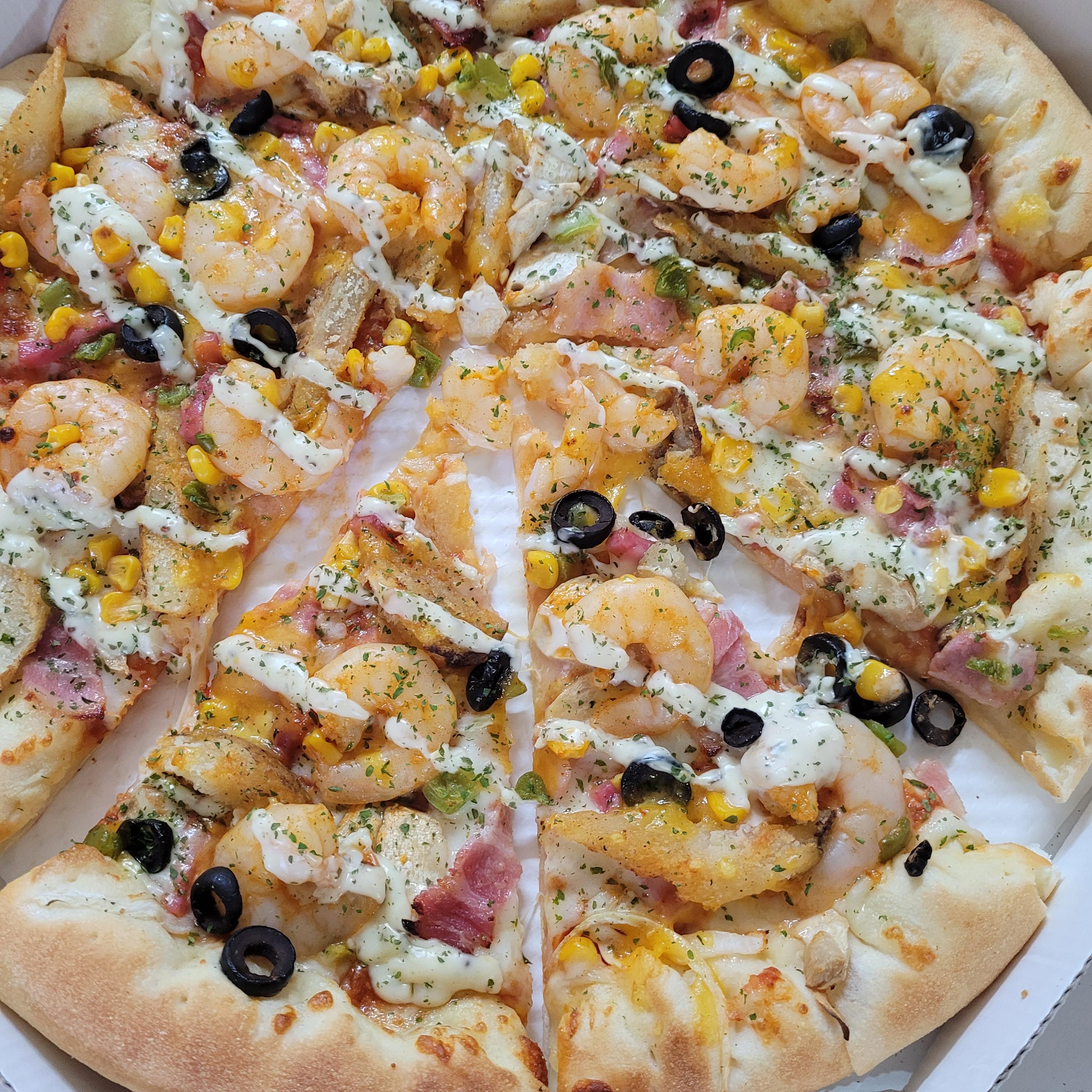 큰새우2개 베이컨,올리브,감자,옥수수콘등