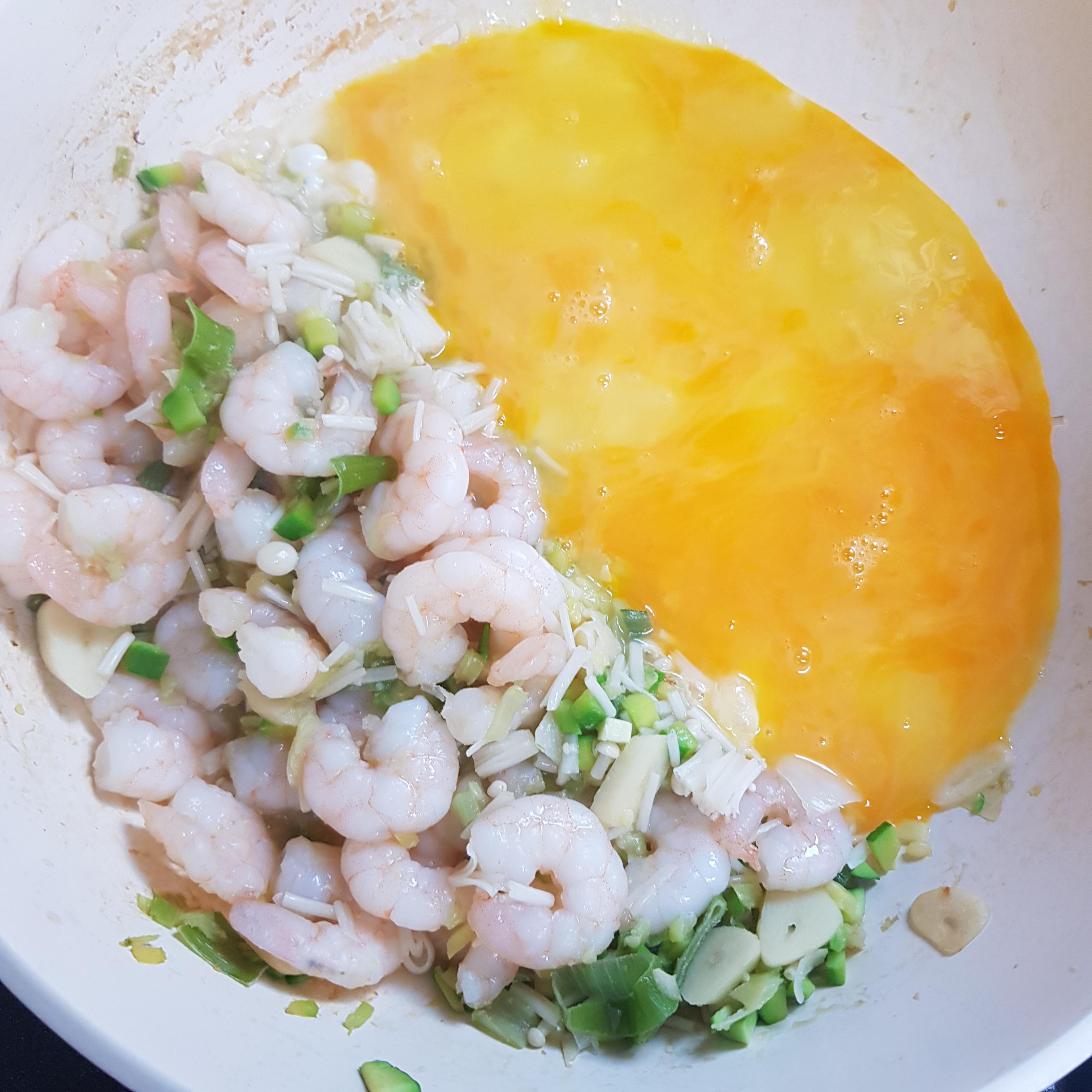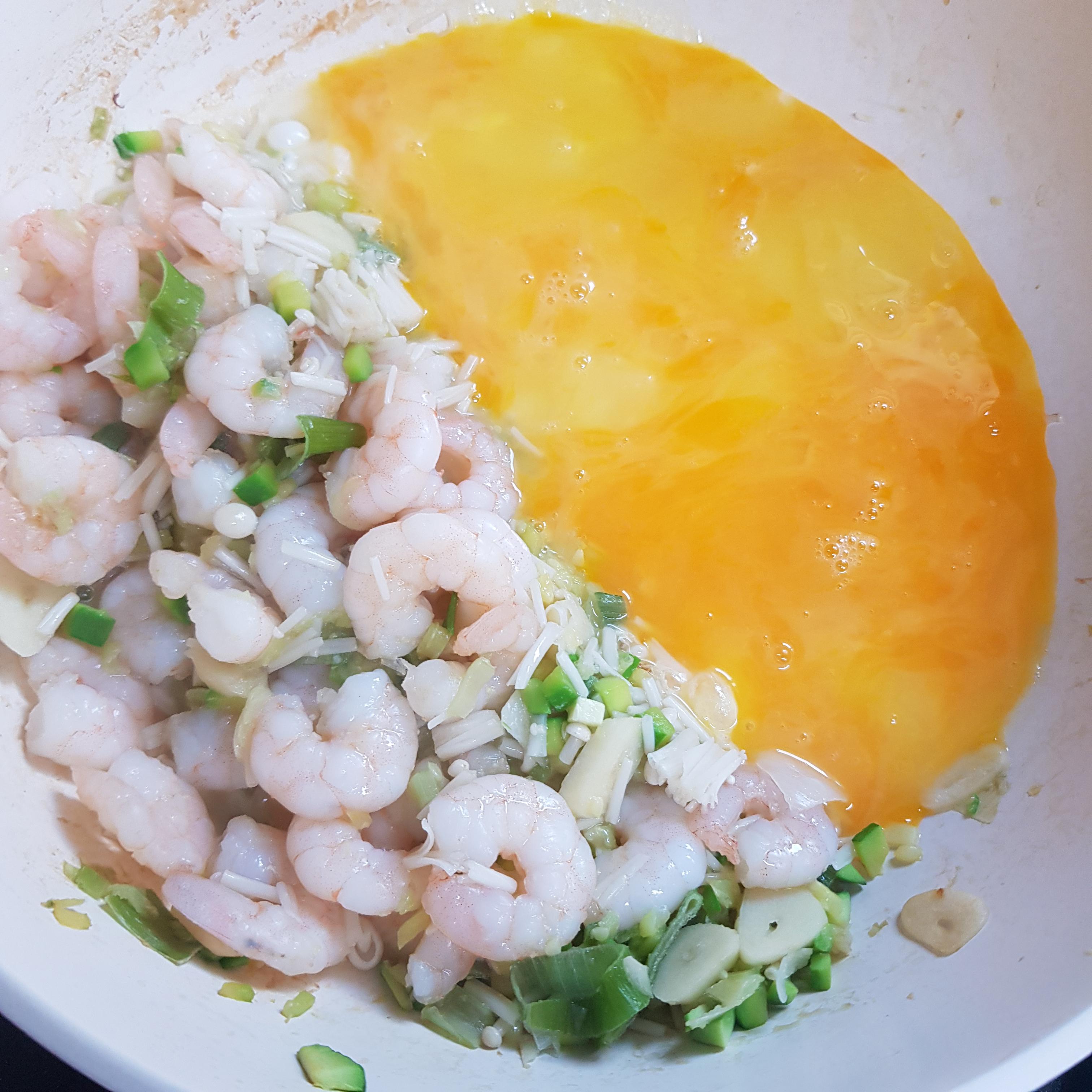 네번째 새우가 살짝 덜 익었을때 계란 스크럼블을 해줍니다.