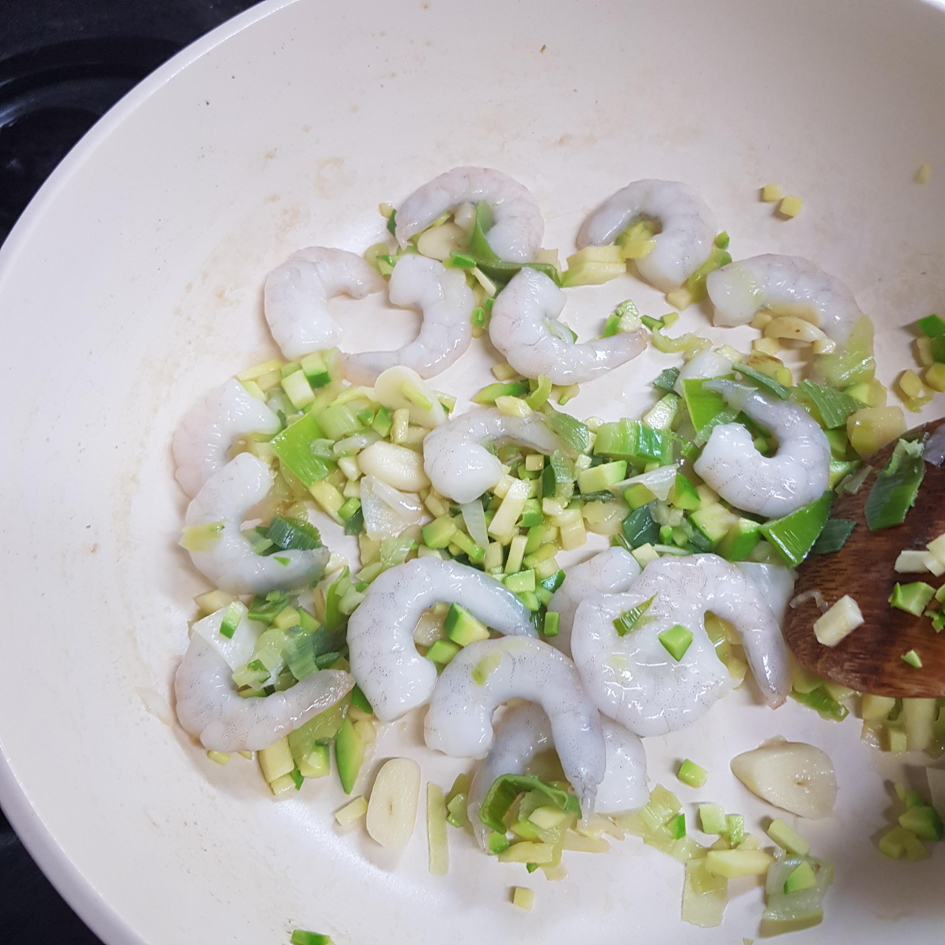 두번째 다진파 기름에 얼린새우 1봉지 애호박을 넣어 볶아주세요.