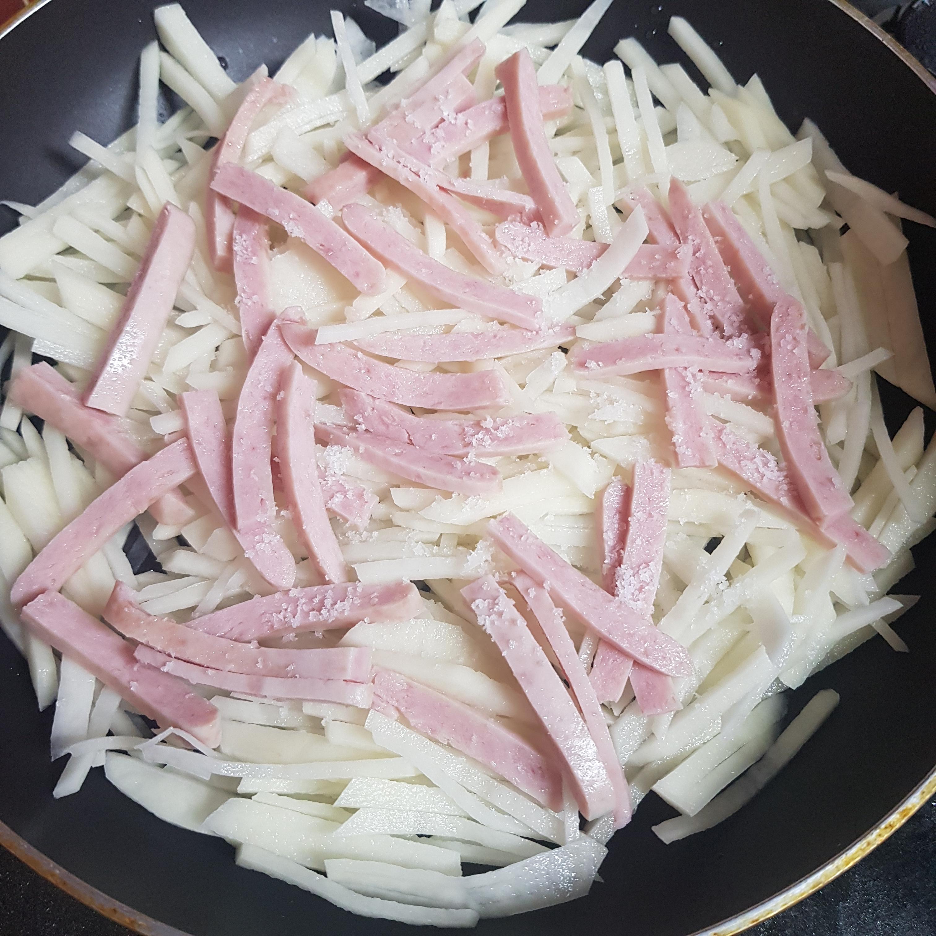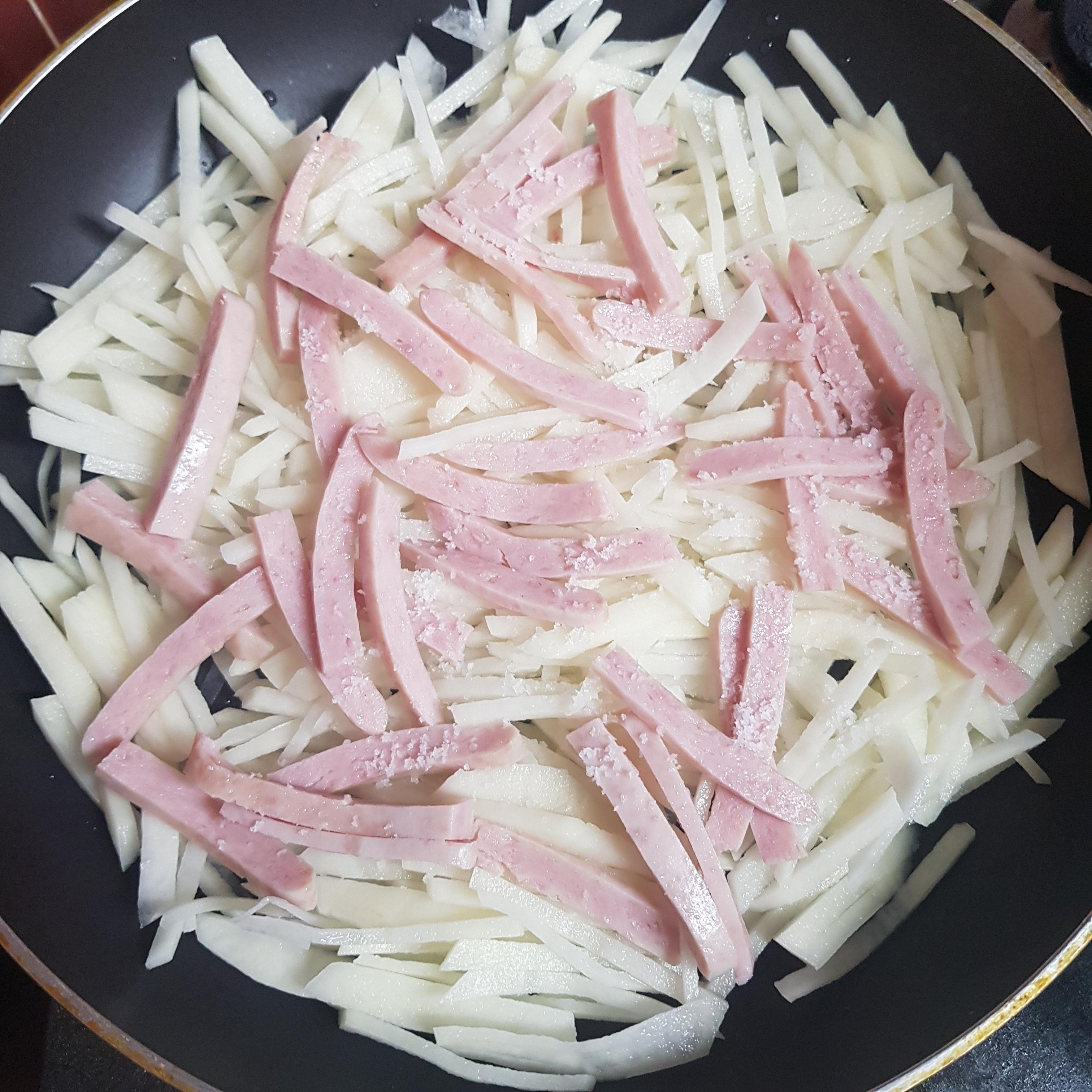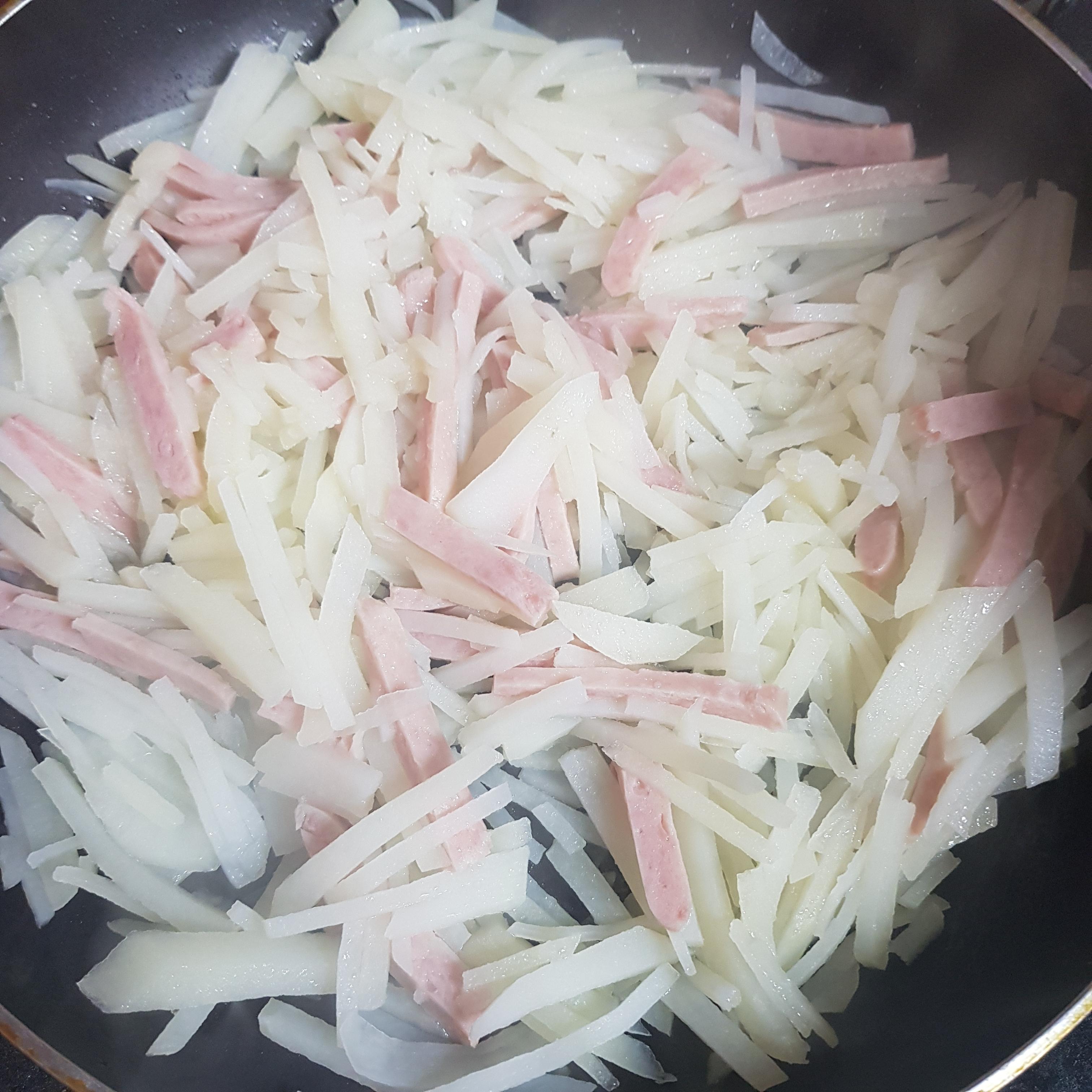 물을 수저 2큰술을 넣어 햄,채썬 감자를 넣고