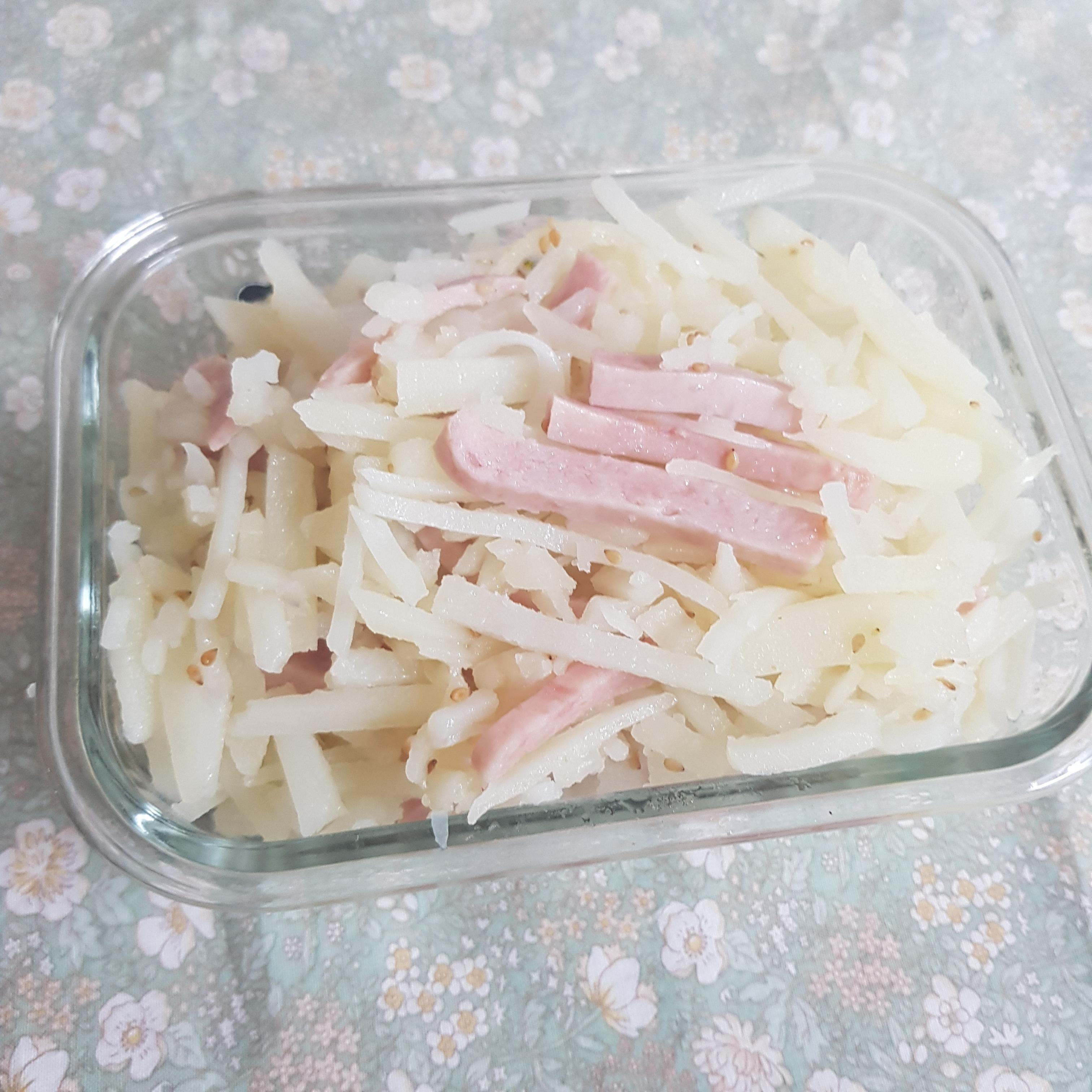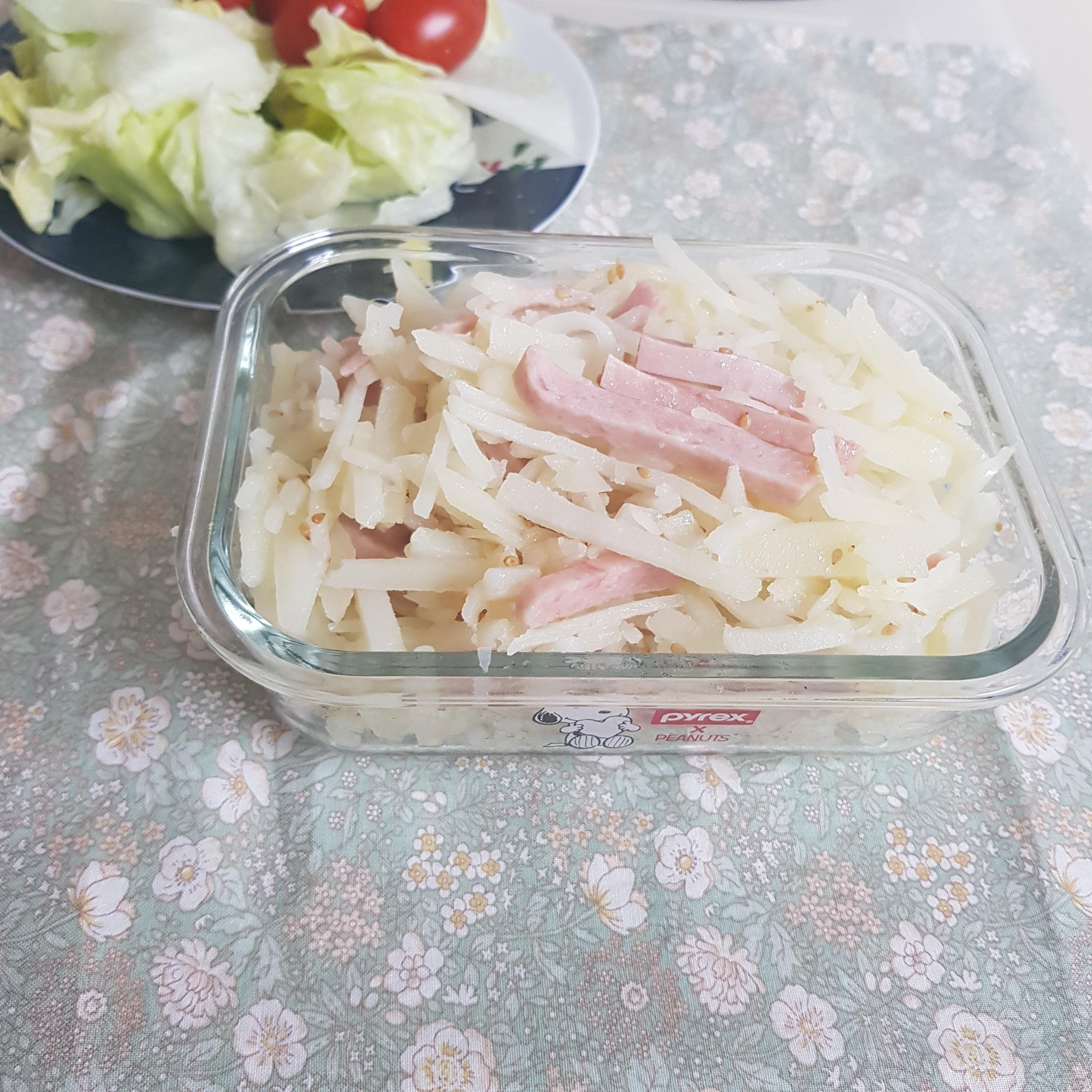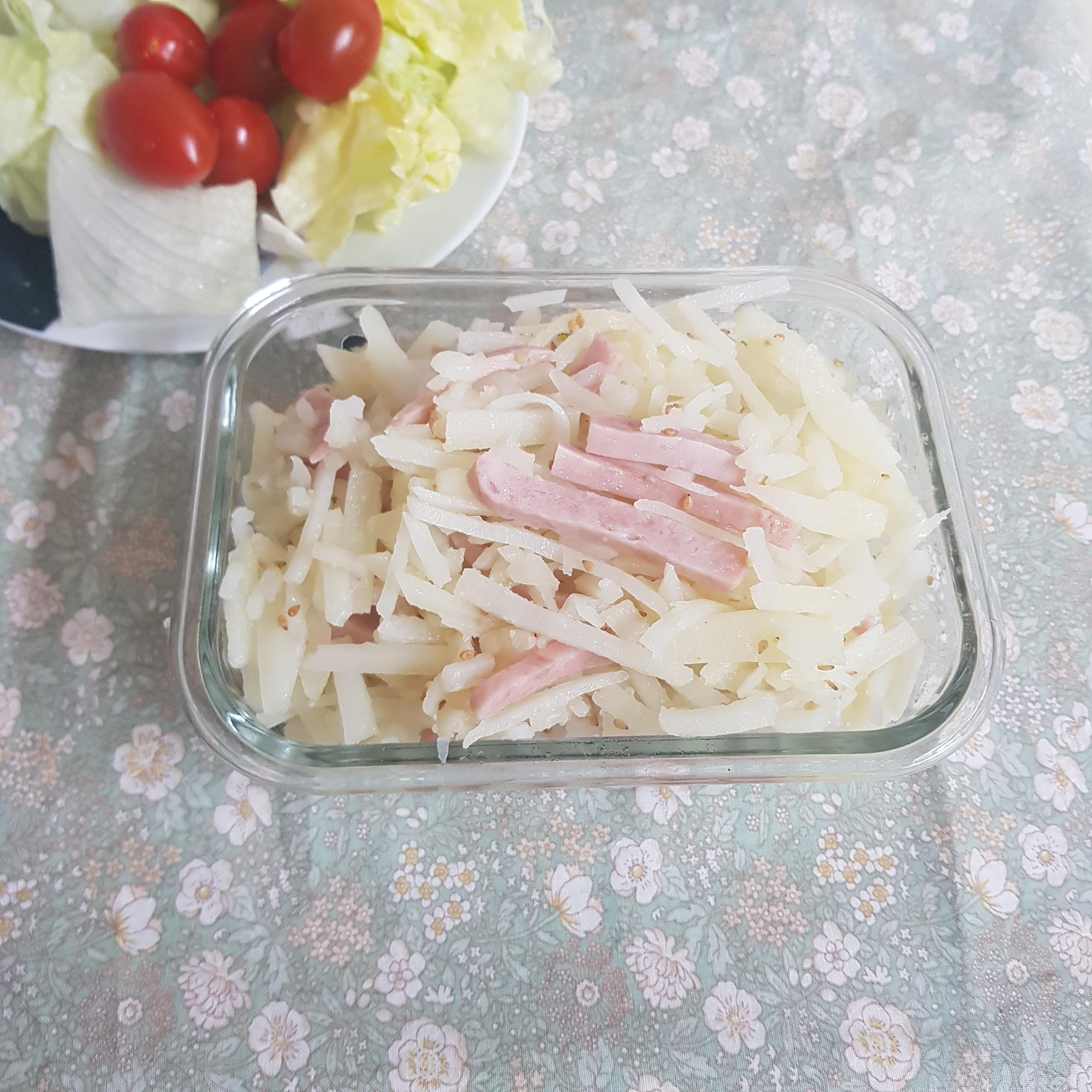 물을 수저 2큰술을 넣어 햄,채썬 감자를 넣고