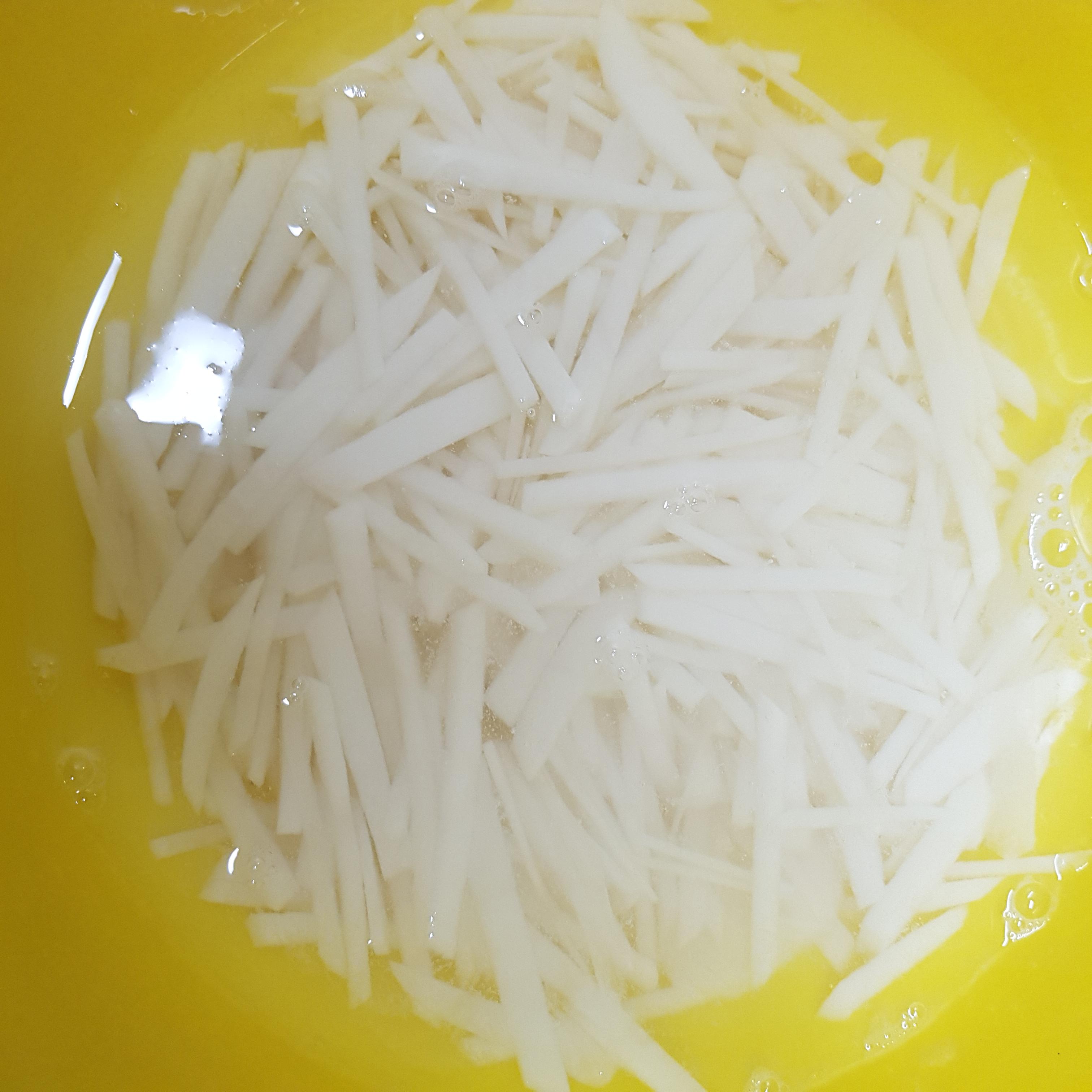 세번째 채썰은 감자는 3번정도 헹구고 10분간 물에 담궈둡니다.