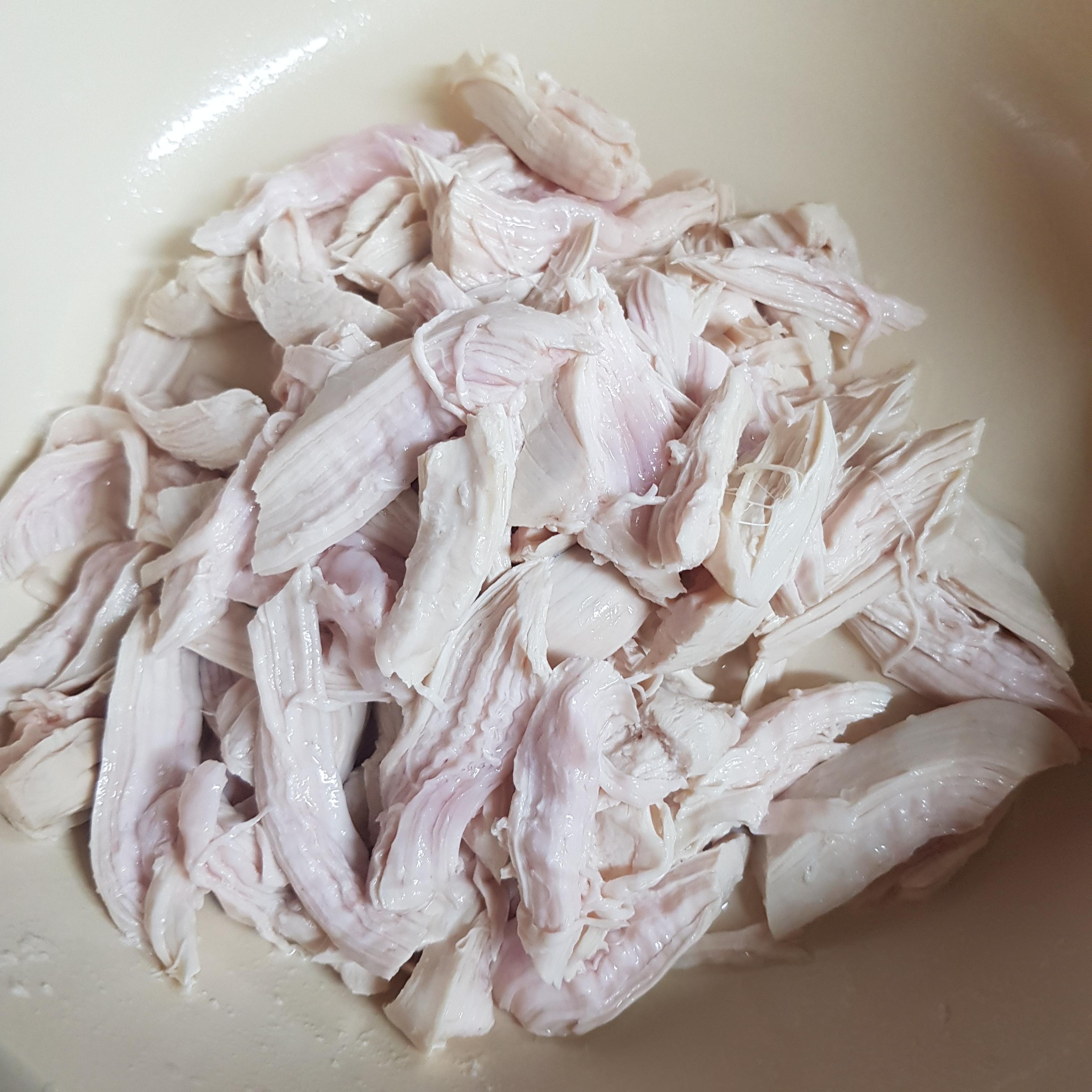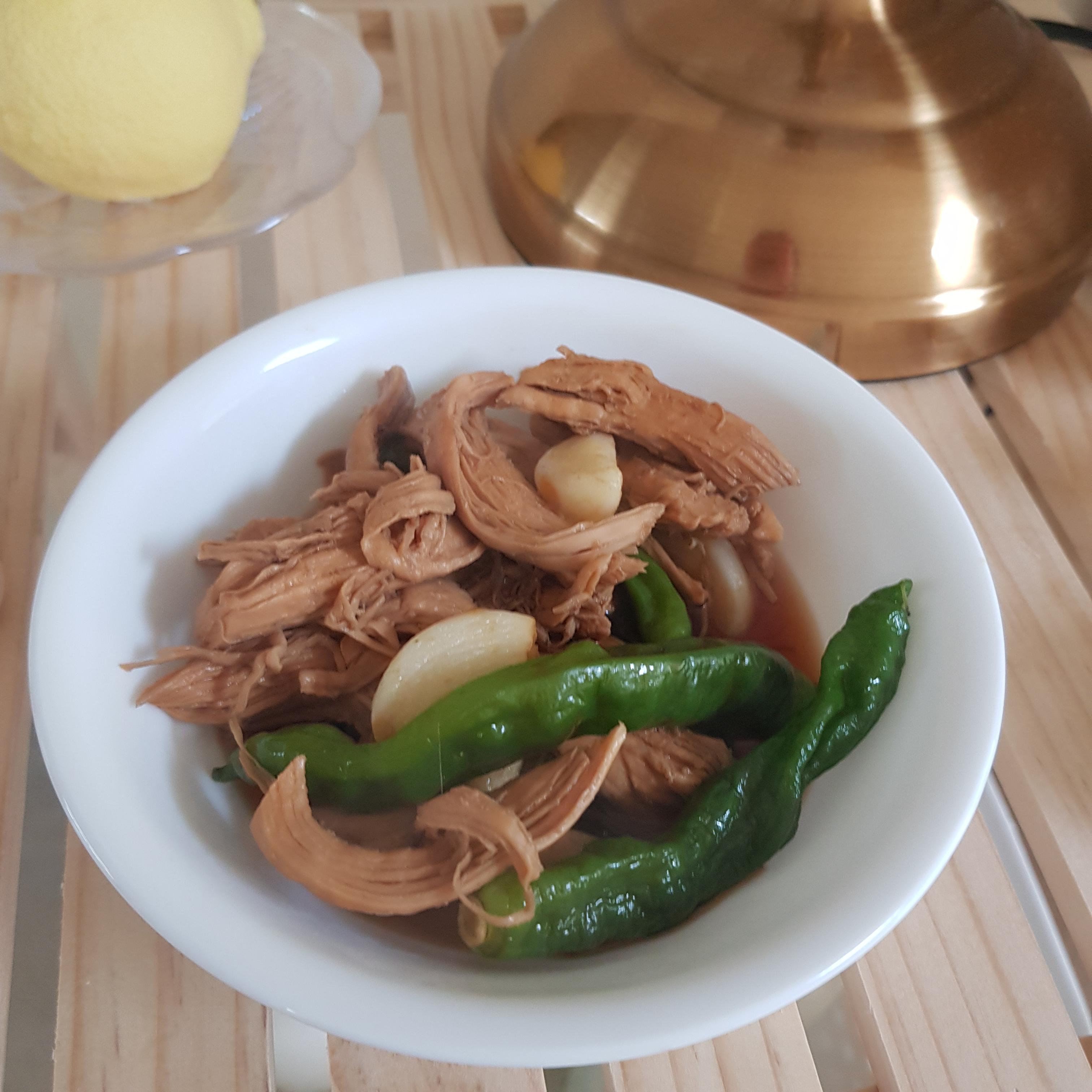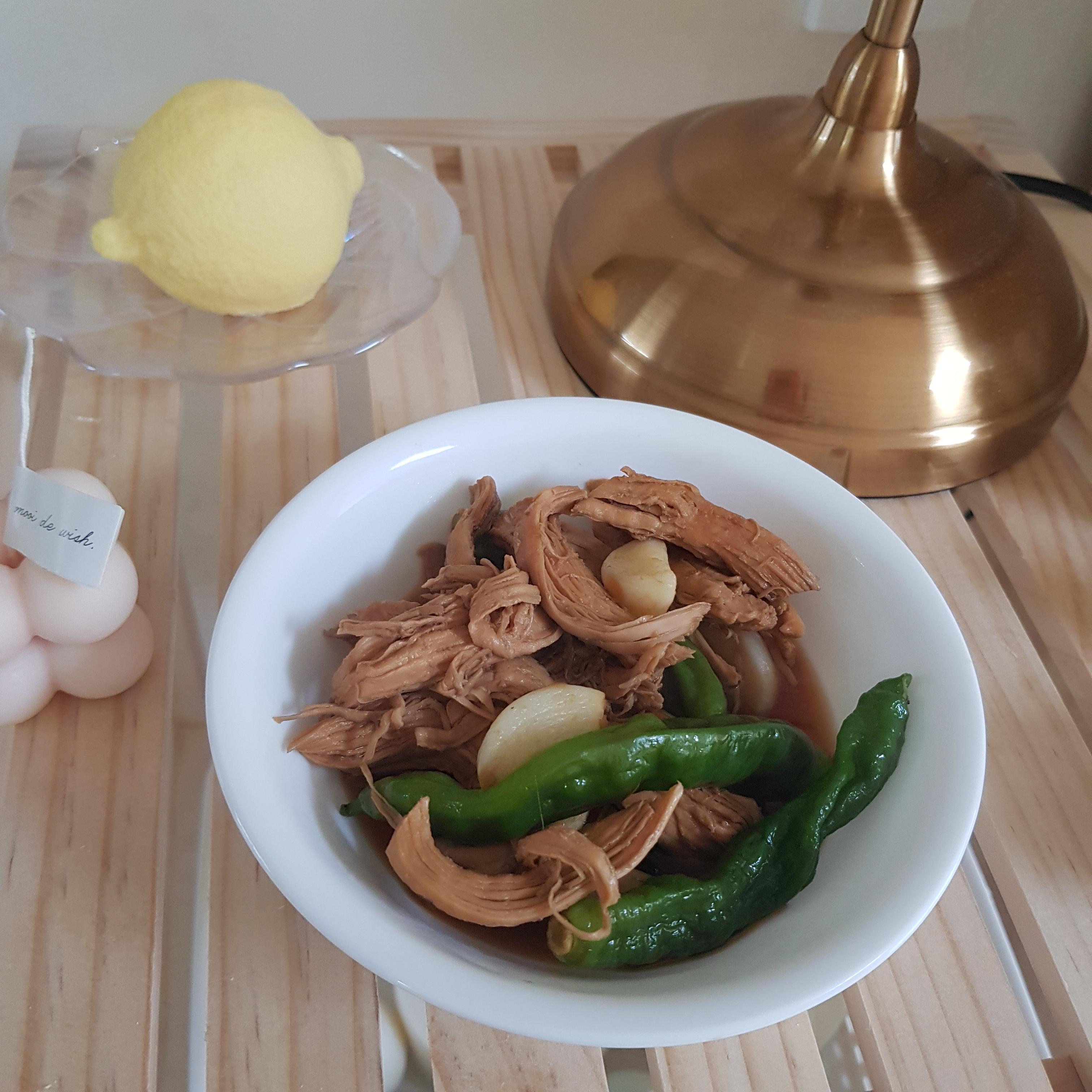 부드럽게 삶아진 닭가슴살과 꽈리고추