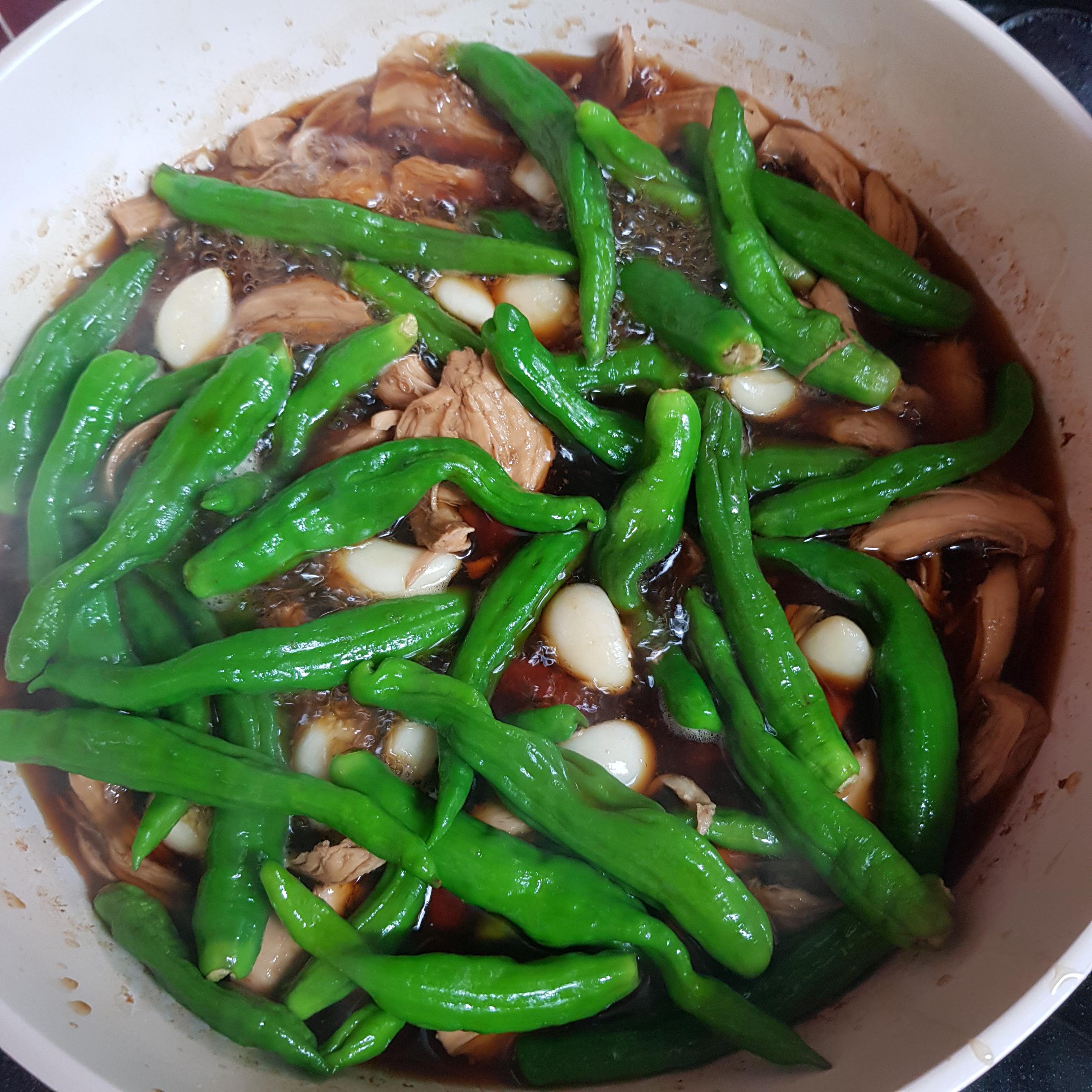 재료: 닭가슴살 500g 꽈리고추 반봉지,통마늘 10개,청주(소주)