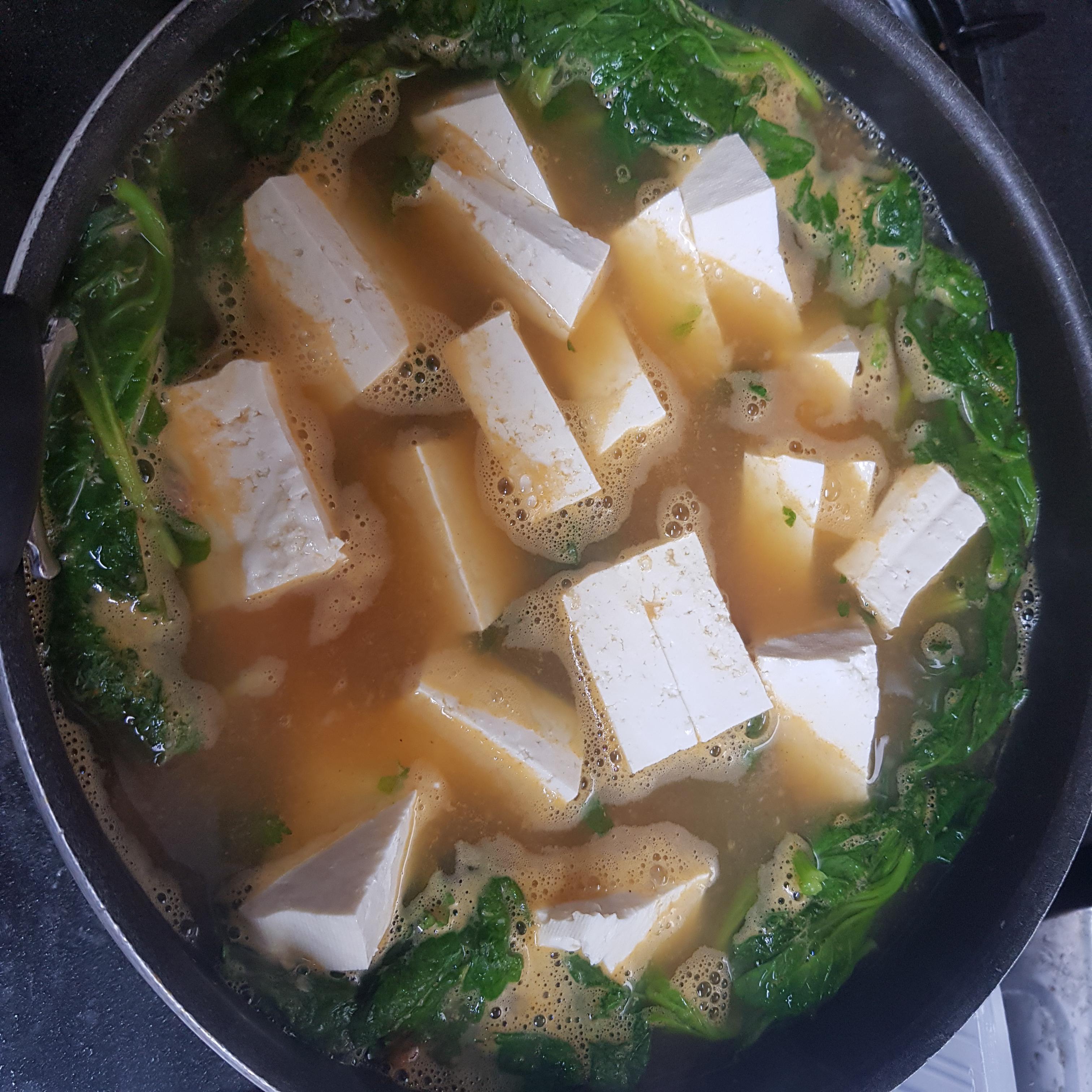네번째 물이 끓으면 씻어논 아욱,두부를 넣어줍니다.