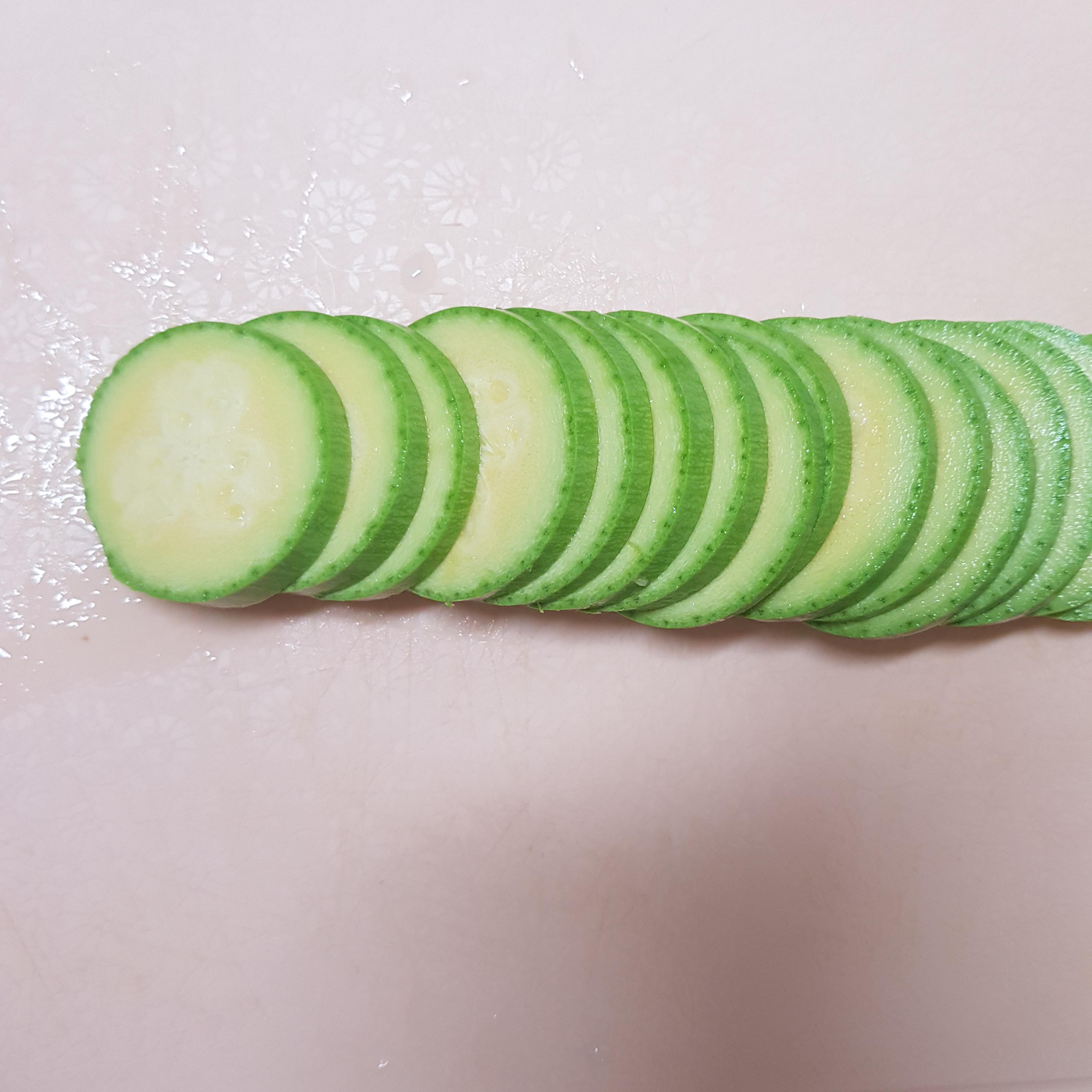 애호박을 씻은후 너무 얇거나 두껍지 않게 짜릅니다.