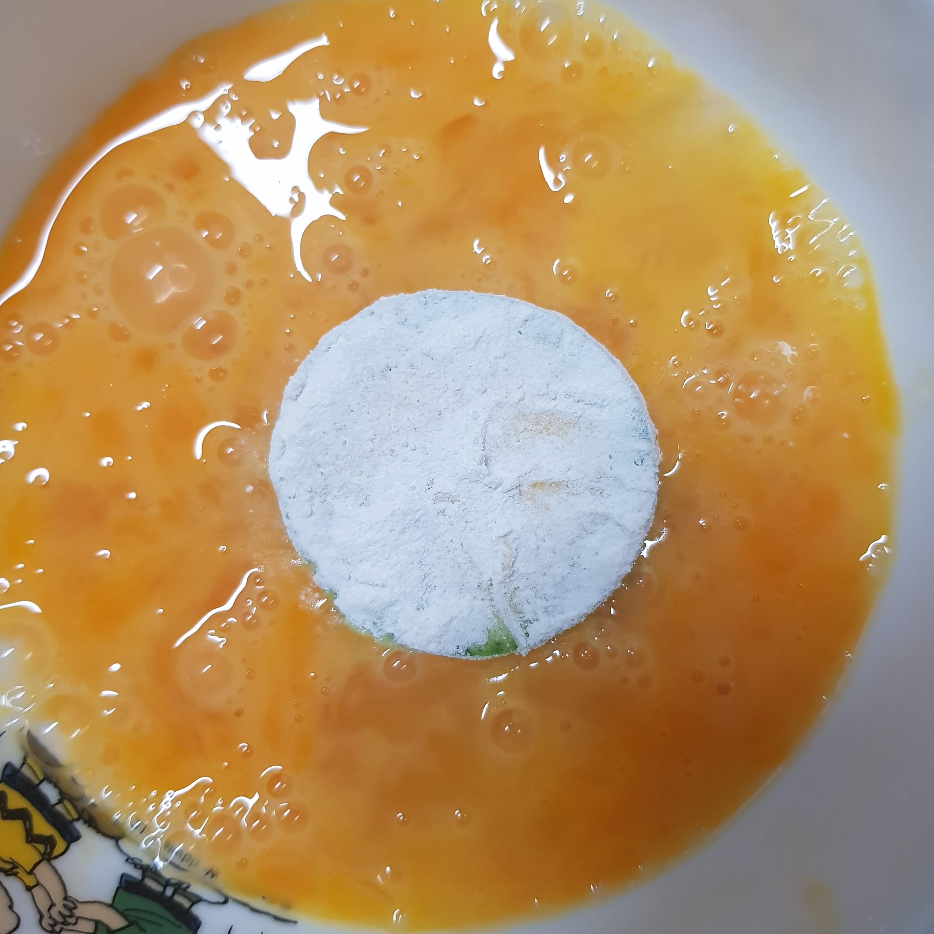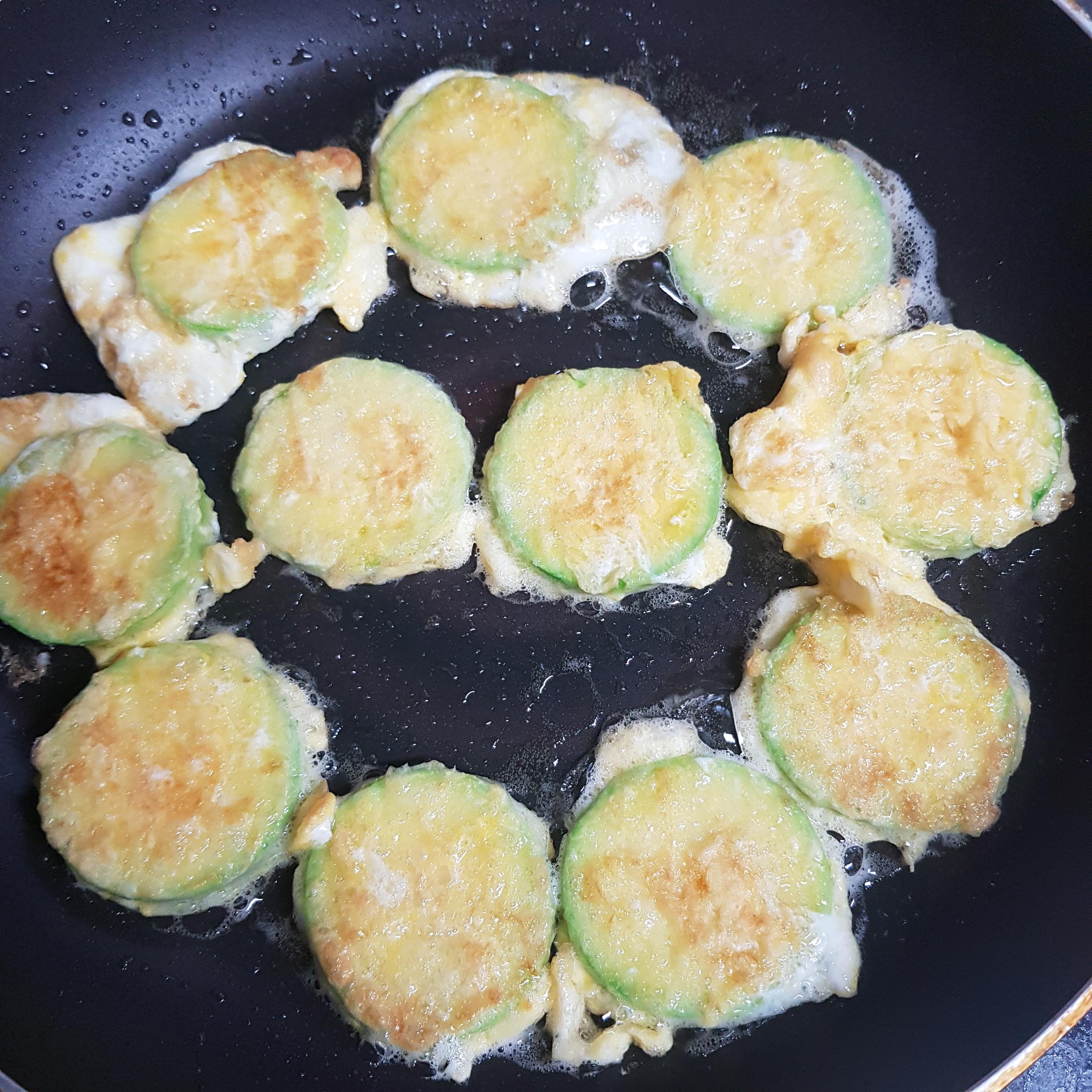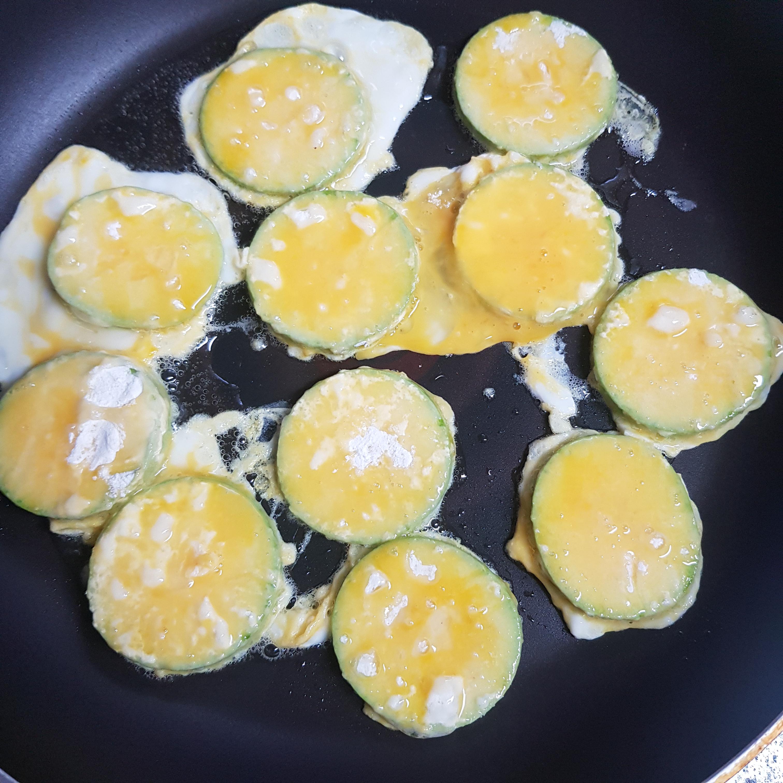 4번째 애호박에 부침가루를 묻혀 계란을 다시 묻혀줍니다.