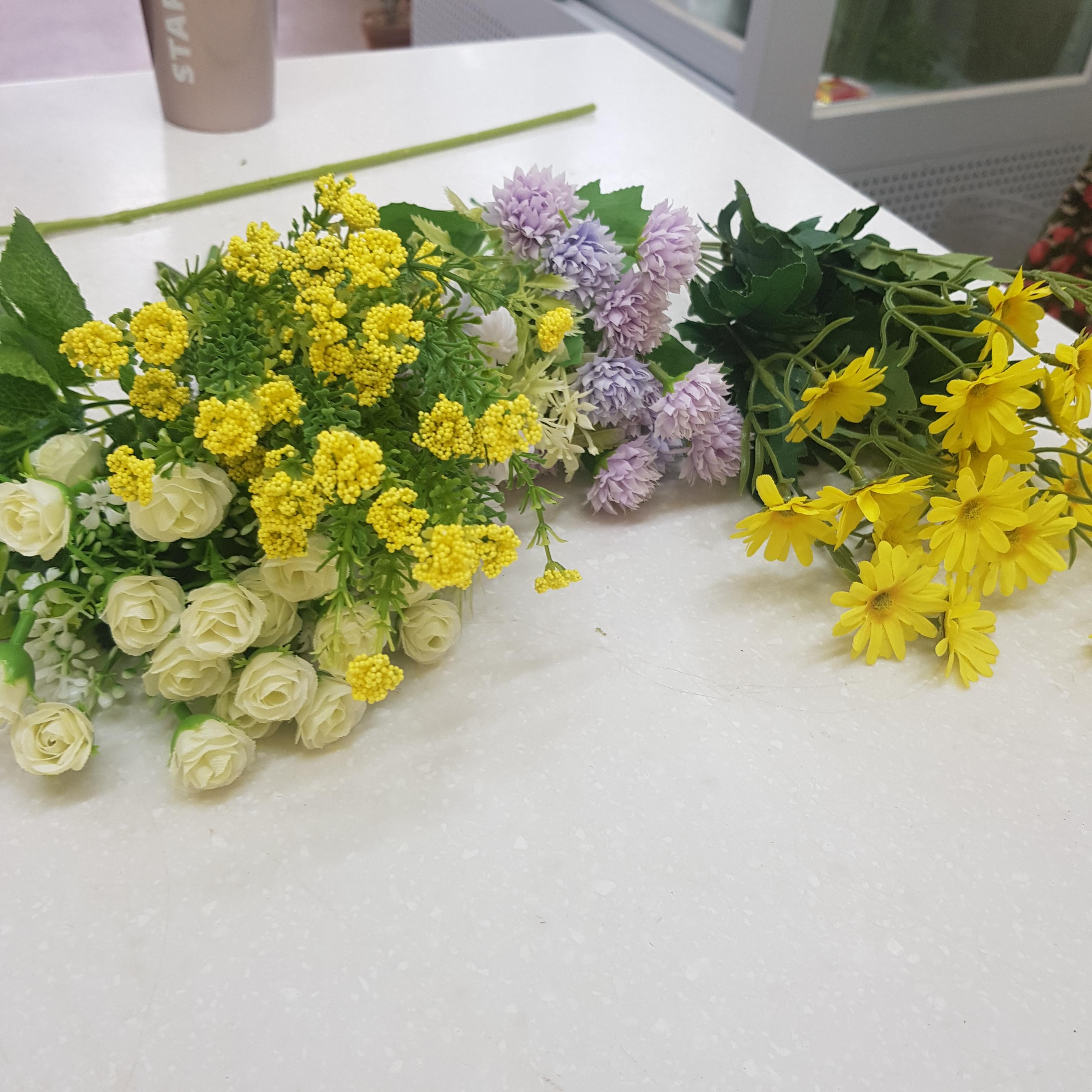 분홍색 메인꽃으로하고 나머지 초록잎,연보라,노랑순으로 꽂기를하였어요.