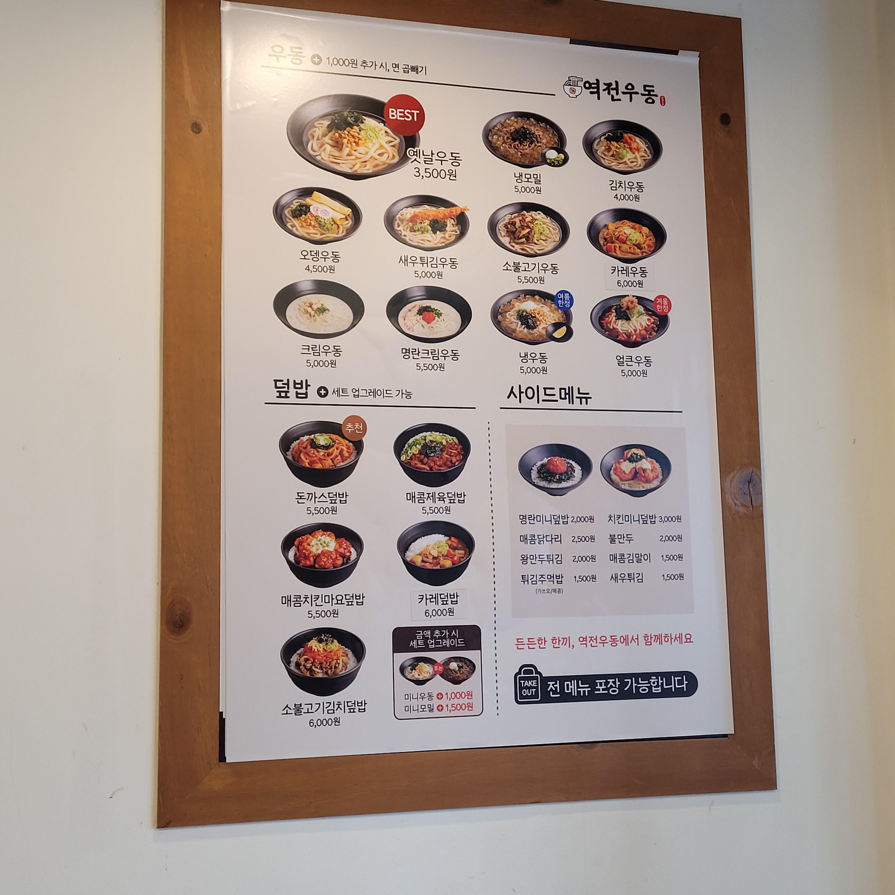 역전우동 메뉴판입니다. 사이드 메뉴 명란미니와 치킨 미니덮밥 둘다