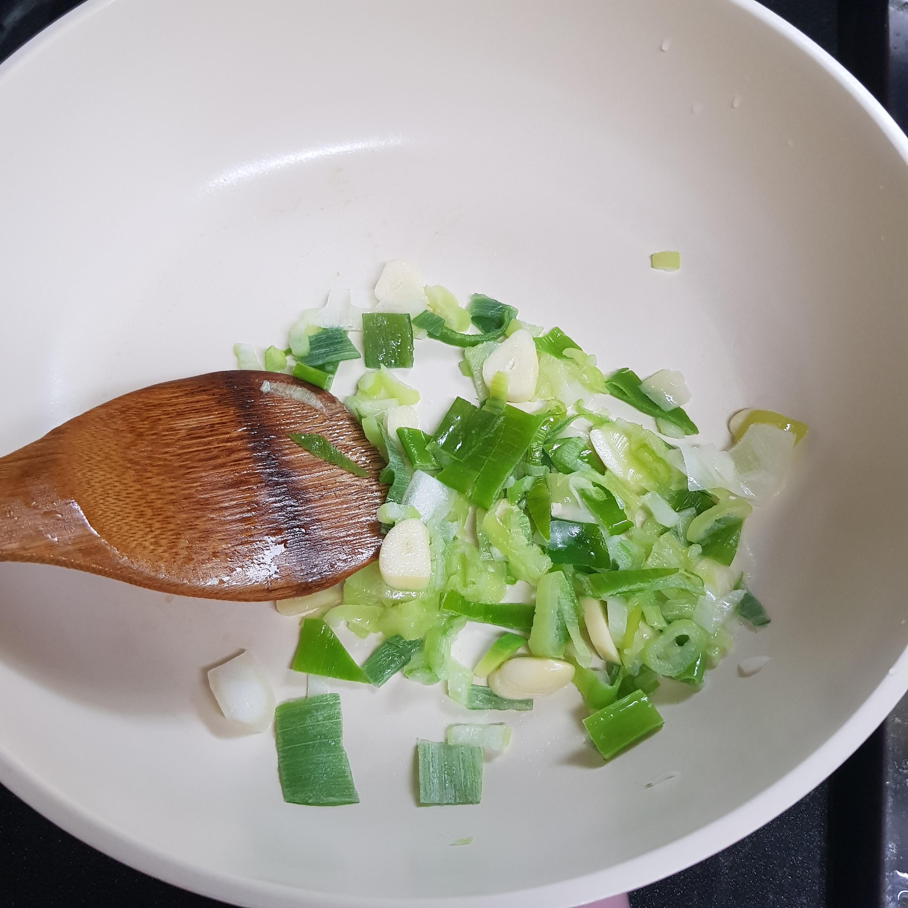 두번째 다진파 기름에 얼린새우 1봉지 애호박을 넣어 볶아주세요.