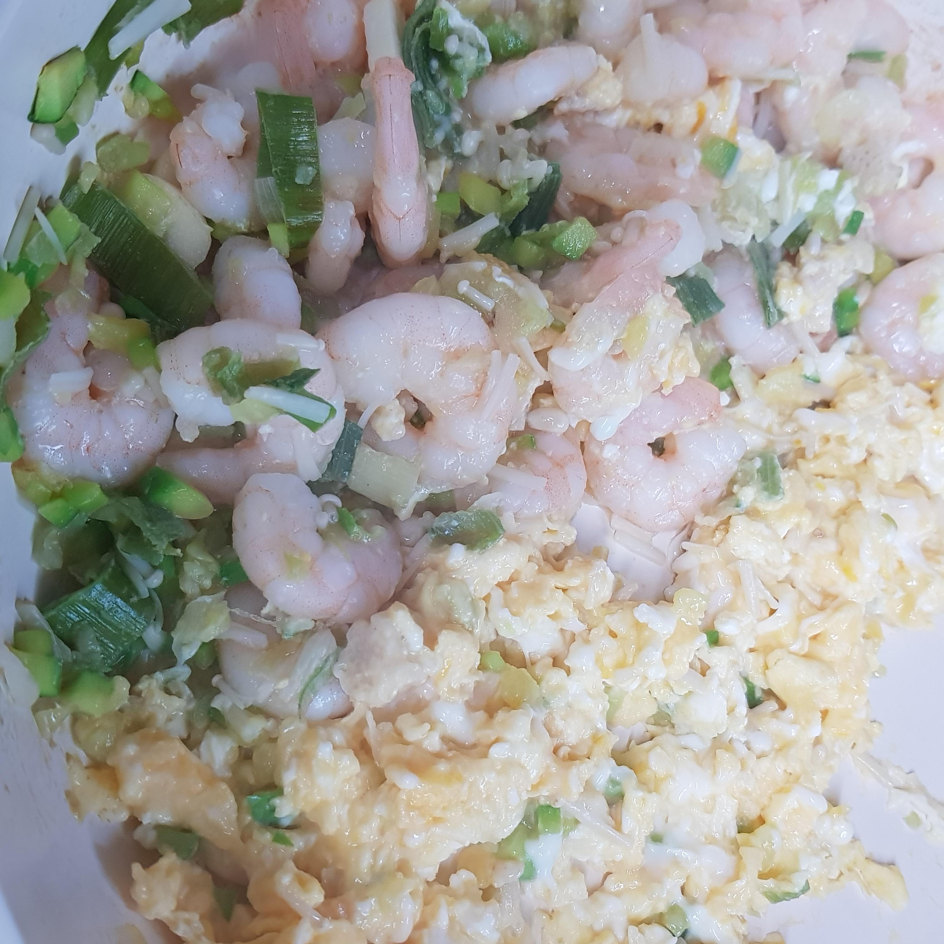 네번째 새우가 살짝 덜 익었을때 계란 스크럼블을 해줍니다.