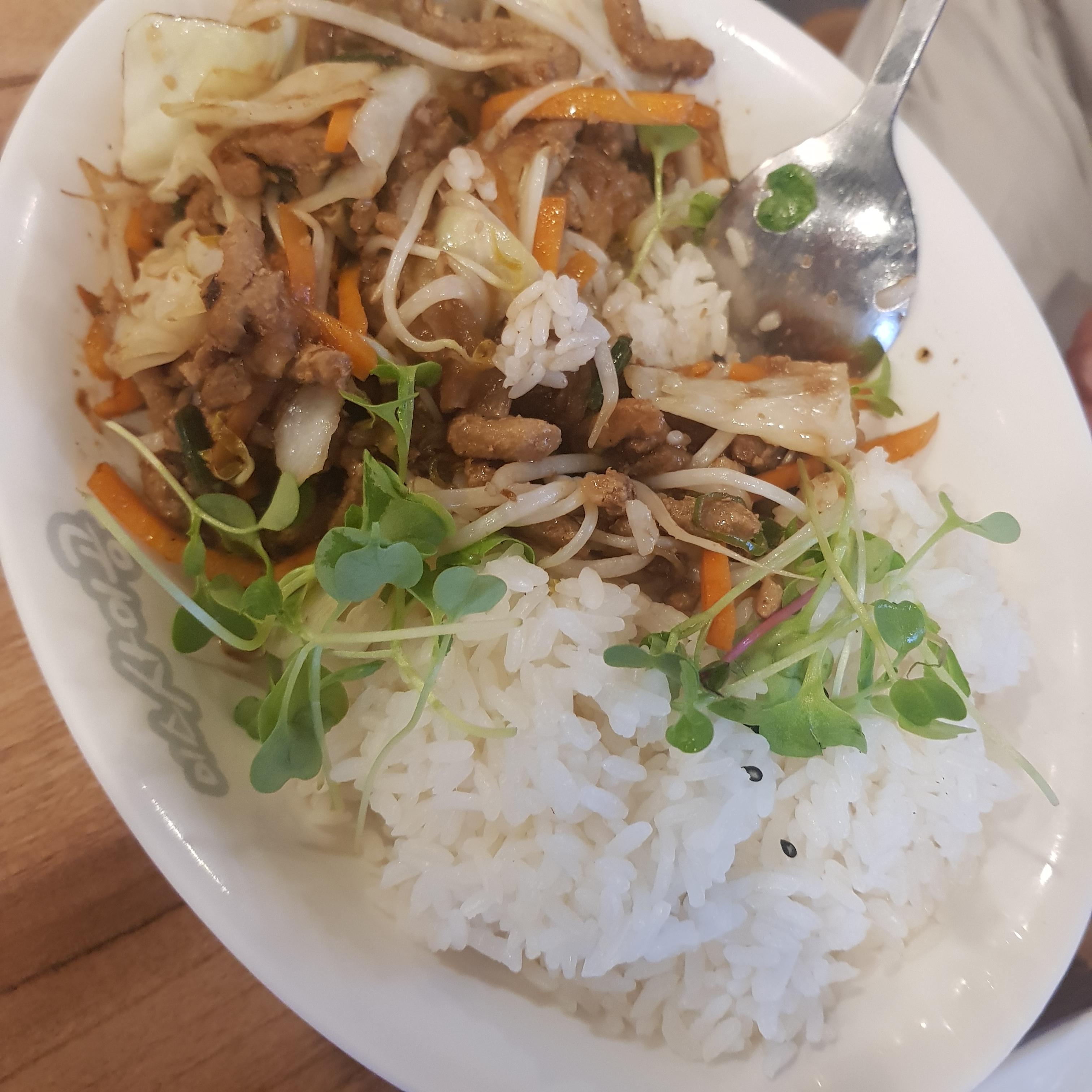 숯불고기 덮밥 야채와 고기밥이 들어 있어요.